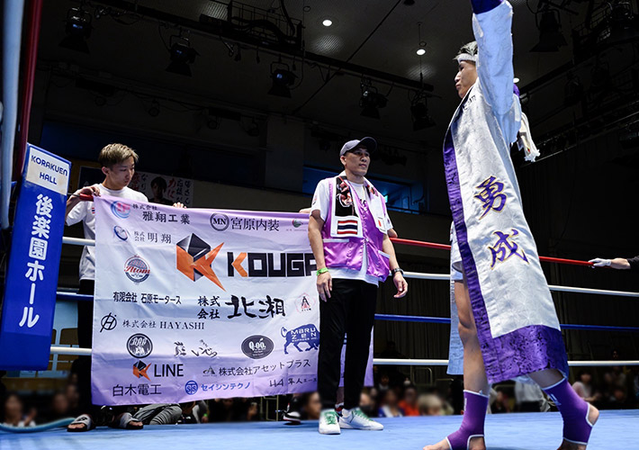 スポンサーロゴを集めた特注旗をキックボクシングの試合の装飾用にご発注いただきました。リングに合わせた特注サイズにて作成しております。