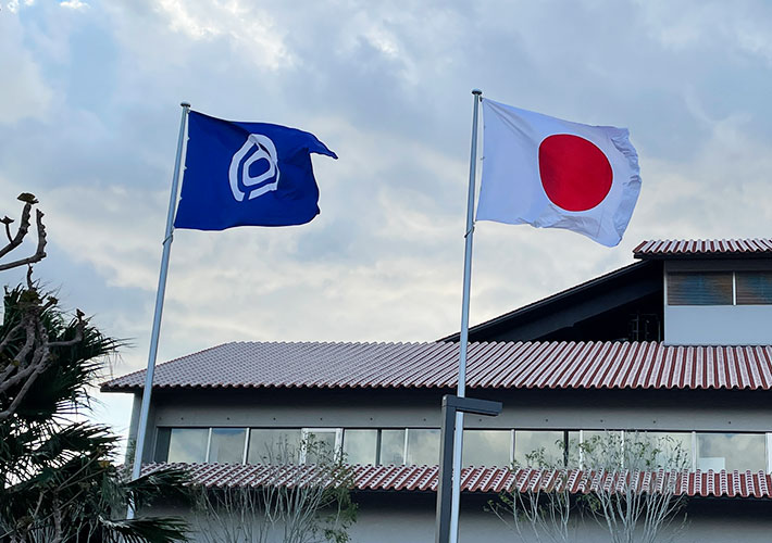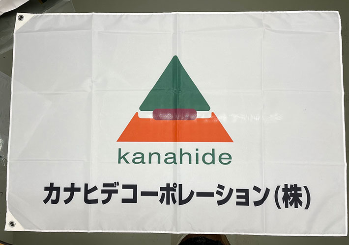 エクスラン生地に反応染め名入れを施し、会社ロゴが目立つオリジナル社旗を製作しました。国旗は同じエクスラン生地の既製品をご注文頂いております。