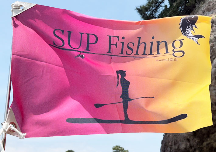 ピンク~イエローの鮮やかなグラデーション印刷が魅力的な手旗になりました!SUPフィッシングをイメージした黒色のシルエットイラストやロゴも綺麗に再現されています。