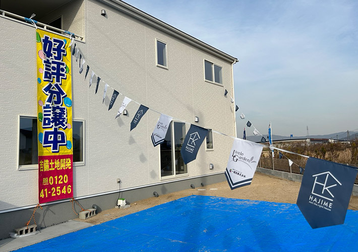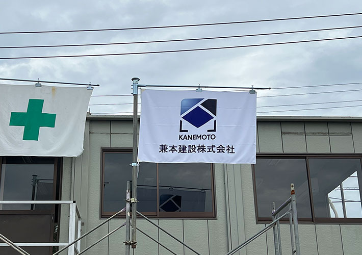 工事現場シートにオリジナル旗を設置してご活用頂いております。耐久性が高く、屋外設置の旗制作にお薦めのツイル生地にプリント製作を行いました。
