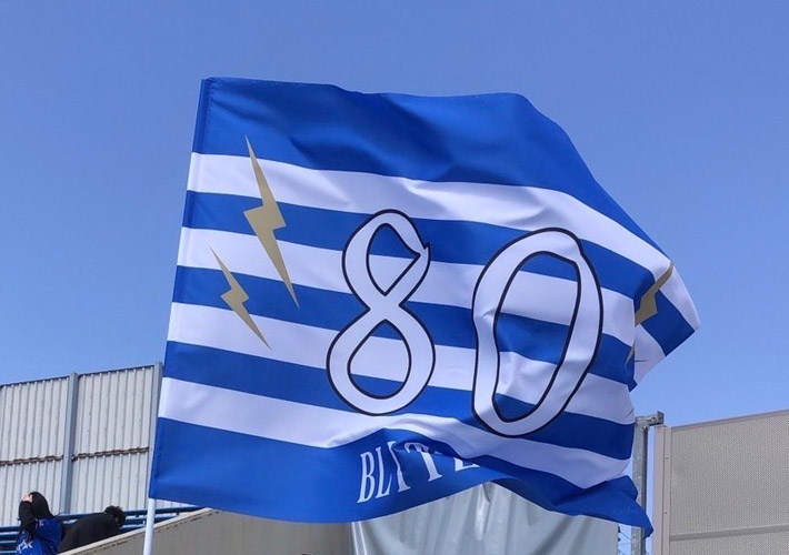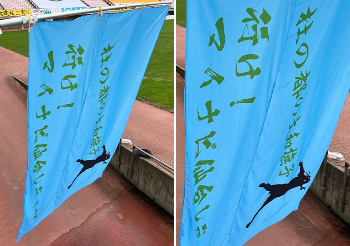 テトロンポンジにフルカラー印刷を施し、鮮やかな水色の応援旗を制作しました。w3,000×h2,000(mm)の大型サイズですが、生地が軽量なので振って使用することが可能です!