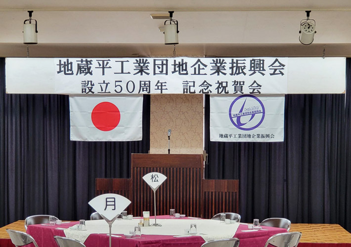 設立50周年の記念祝賀会用の装飾として、当店で作成した団体旗と日本国旗を並べてご活用頂いております。上から吊るして活用しやすいよう、上辺2か所に背面レザーハトメ加工を行いました。