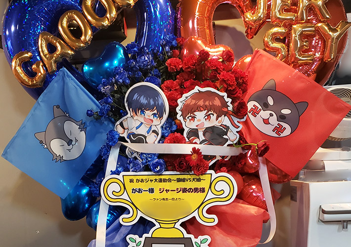 w400×h300(mm)サイズの特注手旗を2本製作しました。イラスト入りの青色・赤色の手旗がフラワースタンドにバランス良く設置され、立体的なアクセントになっています!