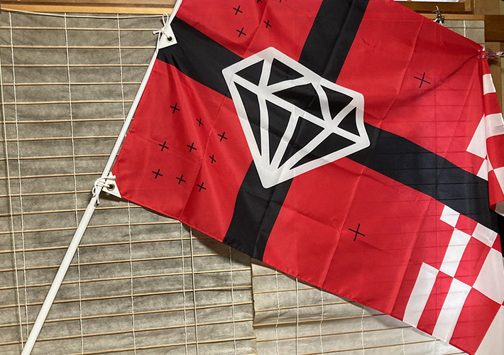 赤色をベースに、紅白カラーの市松模様やダイヤモンドのマークが目立つ華やかな応援旗を製作いたしました。左辺三か所に強度の高いハサミレザーハトメ加工+紐の取り付けを行っております。