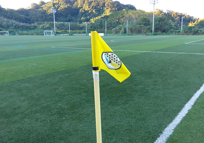 デザインが裏抜けする軽量なテトロンポンジ生地を使用したコーナーフラッグを制作しました。全面の黄色や中央のエンブレムもくっきりと色鮮やかで、サッカーグラウンドで存在感を発揮する仕上がりです!
