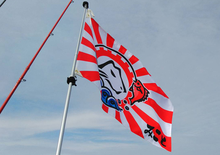 船舶に掲揚する団体旗を、耐久性の高いテトロンツイル生地にて作成いたしました。手書き風のイラストを昇華転写印刷によって鮮やかに再現しております。