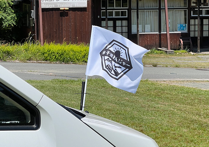 白地に黒色のロゴが映えるオリジナル手旗を自動車に取り付けてご活用頂きました!引率旗の定番サイズで仕立てており、目立ちやすさは抜群です。