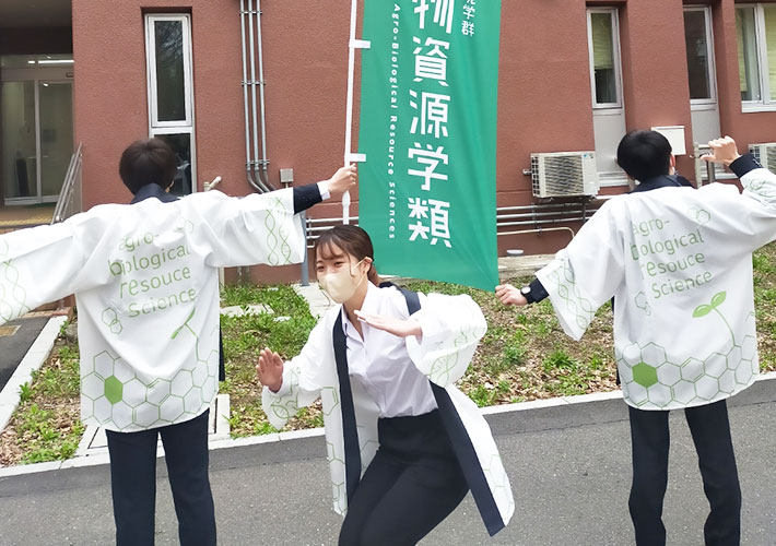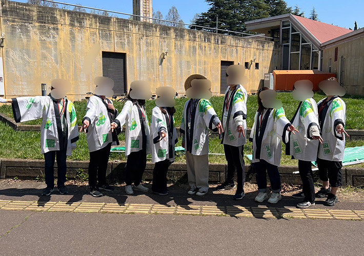 薄手のテトロントロピカル生地に全面フルカラー印刷を施し、資源をテーマにした緑色のイラストやロゴが映えた、爽やかな印象の新歓法被を製作しました!