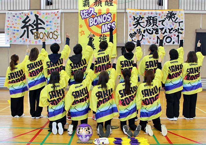 明るい黄色地に虹色の配色がポップな印象で、背面の大きなロゴもインパクト抜群なオリジナル応援法被を制作いたしました。試合会場でもよく目立つこと間違いなしの仕上がりです!