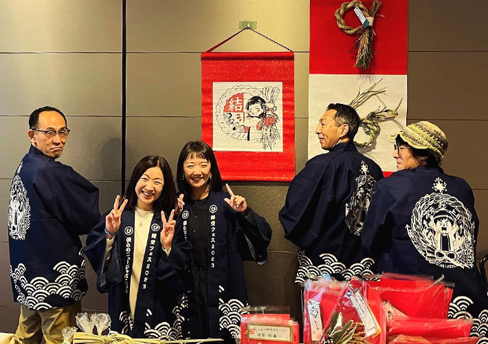 キャッチコピーとロゴを効果的に配置した展示会用オリジナル法被をセミオーダー制作しました!ブースと同じ青×白の配色が誠実な印象です。