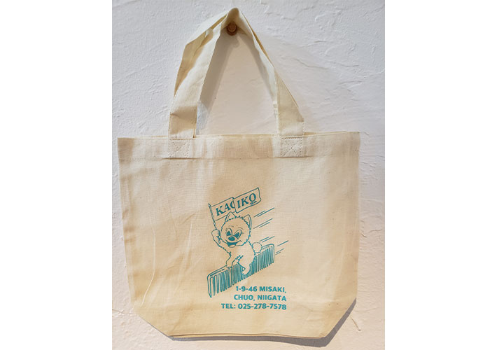 無漂白コットンを使用したサスティナブルなトートバッグに、柔らかな薄茶色のシルク1色印刷にてロゴプリントを行いました。レジ袋サイズで、普段使いに重宝する特注グッズです!