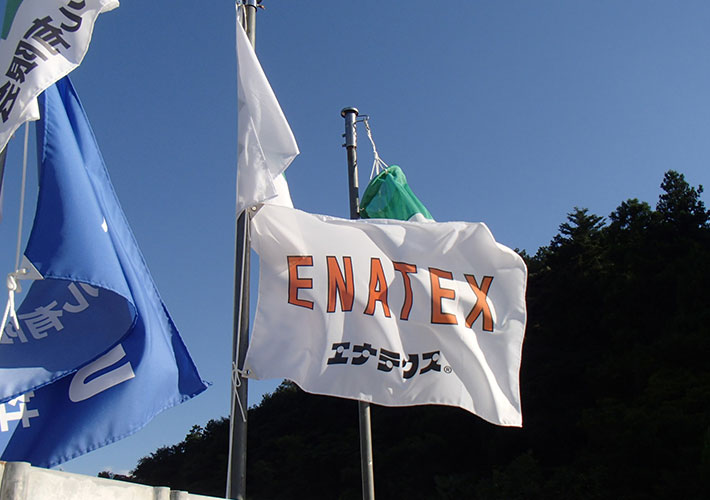 風抜けがよく、耐久性も抜群なエクスラン生地を使用して制作いたしました。反応染めにて全面をしっかり染めあげているため色落ちもしにくい社旗です。