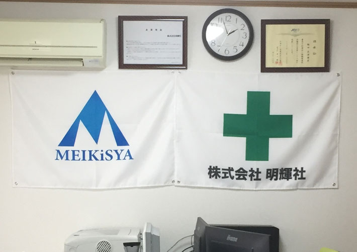 会社ロゴと緑十字デザインの2種類の旗を制作いたしました。社旗の中では小さめ定番サイズのw1,000×h700(mm)で、屋内装飾としても十分存在感があります。