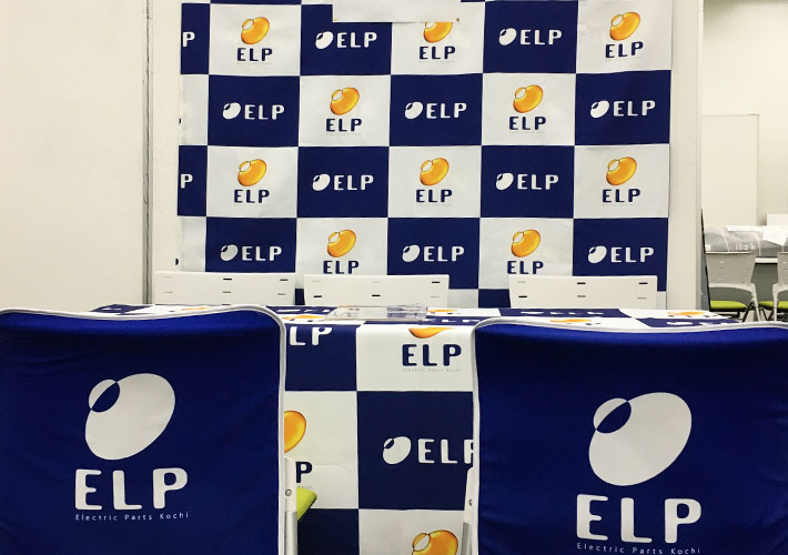 正面にロゴとマスコットキャラクターをプリントした前掛けタイプのテーブルクロスを製作致しました。布の面積が少ない分、設置と撤去をスムーズに行えます。